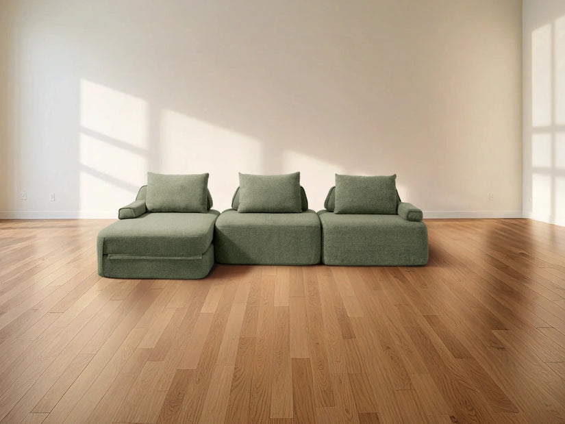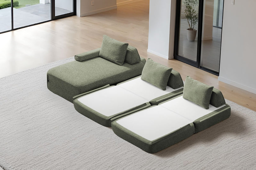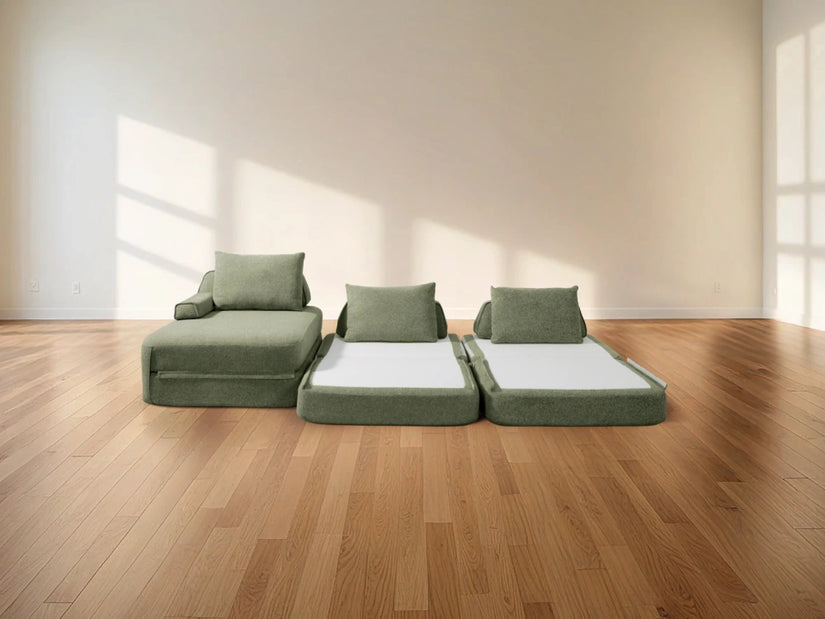 Cushie Modular Sofa Bed transforms from a stylish seat to a cozy bed in seconds—just flip and snooze. Unlike traditional sleeper sofas with noisy metal frames and complex pull-outs, Cushie keeps it simple and silent.