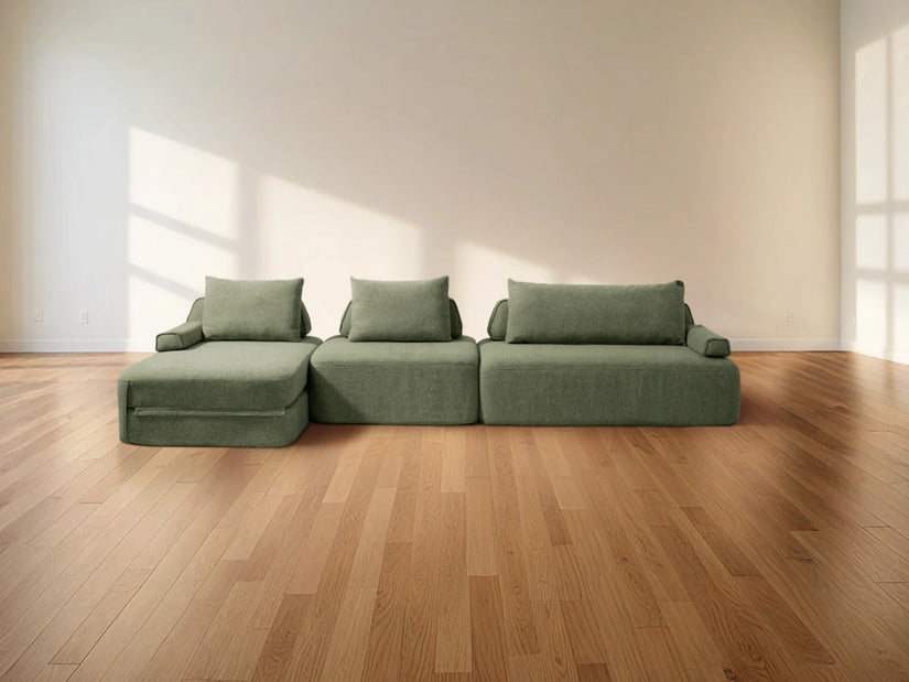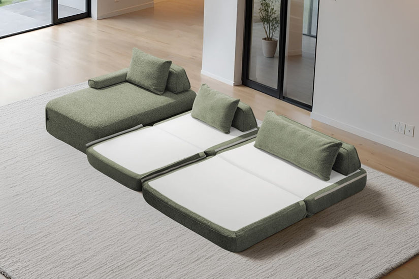 Cushie Modular Sofa Bed transforms from a stylish seat to a cozy bed in seconds—just flip and snooze. Unlike traditional sleeper sofas with noisy metal frames and complex pull-outs, Cushie keeps it simple and silent.