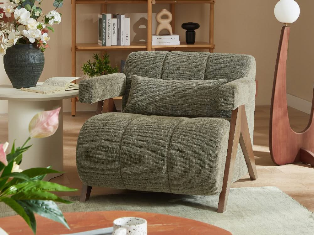 The Frank Armchair embodies a modern twist on Mid-Century Modern aesthetics, balancing bold structure with soft comfort. Featuring a sturdy ash and plywood frame, it offers a dependable foundation, while the richly textured polyester upholstery introduces a sophisticated green tone to any interior. Designed with both beauty and relaxation in mind, its generously cushioned seat and additional lumbar pillow provide extra support, inviting you to sink into effortless comfort. The harmonious contrast between the deep green fabric and the warm wooden frame further accentuates its sculptural silhouette, making Frank an inviting centerpiece for living spaces, reading nooks, or bedrooms.